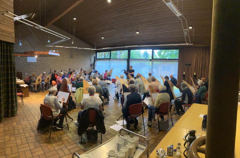 38 Musiker*innen sind gekommen, um miteinander den ganzen Tag neue Musikstücke zu lernen, die Gisela Schmitt extra für diesen Tag Veeh-Harfentauglich umgeschrieben bzw. komponiert hat. Ein bunter Mix aus Klassik, Filmmusik, berühmten Liedern, Hagios-Liedern und Duetten für zwei Harfen tauchte die Anwesenden in einen Rausch von Tönen. Mit so vielen Harfen war der Klangteppich gewaltig und berührend.